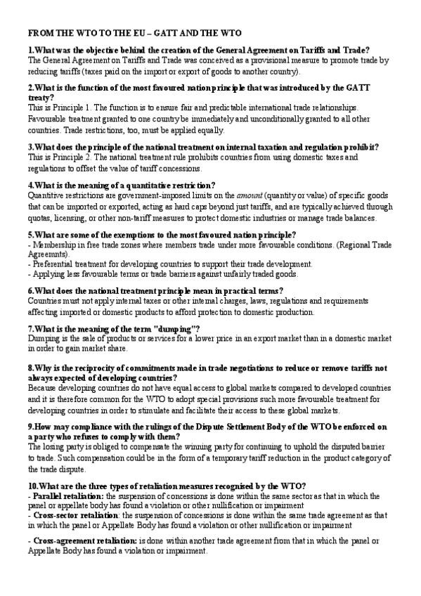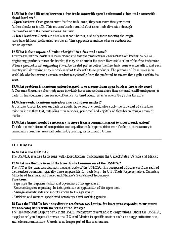 Topic 1-3 explained + adressed questions from the 2025-2026 slides: - TOPIC 1. FROM THE WTO TO THE EU - GATT AND THE WTO - TOPIC 2. THE USMCA AND MERCOSUR - TOPIC 3. THE EU - THE FREE MOVEMENT OF GOODS