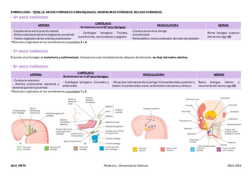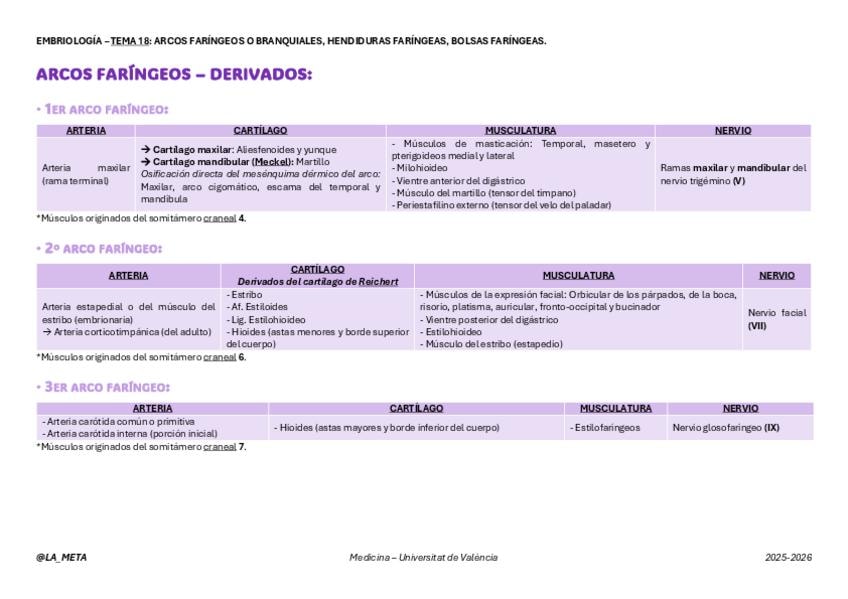 Tablas de resumen con fotos de los derivados de los arcos faríngeos, hendiduras faríngeas y bolsas faríngeas. Tema 18 de Embriología: Arcos faríngeos o branquiales, hendiduras faríngeas, bolsas faríngeas.