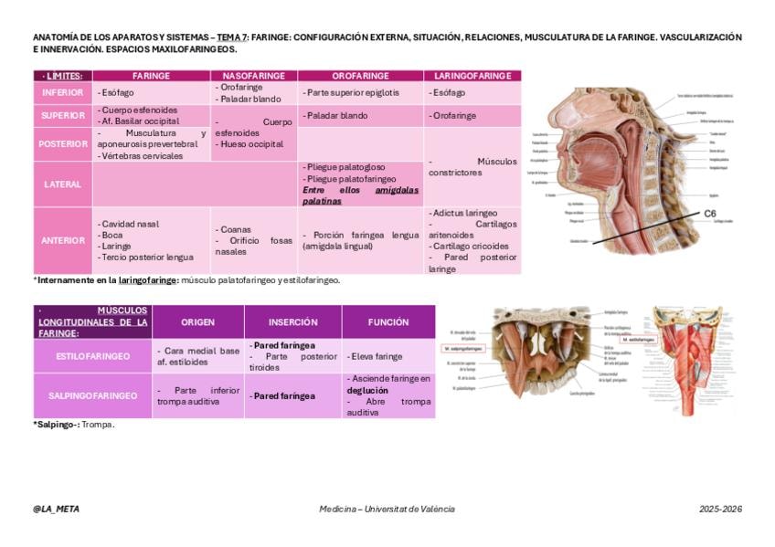 Tablas de límites de la faringe, nasofaríngeo, orofaringe y laringofaringe, además de los espacios perifaríngeos. Tablas de origen, inserción y función de los músculos del Tema 7 de Anatomía de los Aparatos y Sistemas: Faringe: Configuración externa, situ