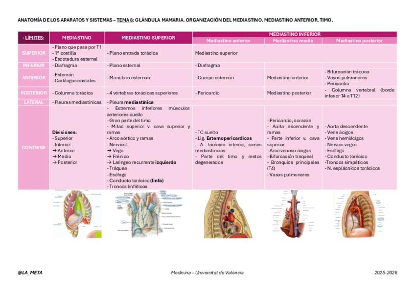 Tabla de resumen de los límites y contenido del mediastino y sus divisiones, además de la glándula mamaria y timo. Tema 8 de Anatomía de los Aparatos y Sistemas: Glándula mamaria. Organización del mediastino. Mediastino anterior. Timo.