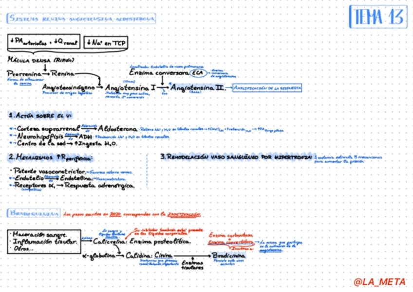 Esquema de los procesos del sistema renina-angiotensina-aldosterona y de bradiquinina explicados en el Tema 13 de Fisiología Médica I: Regulación de la presión arterial.