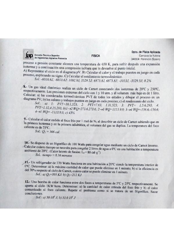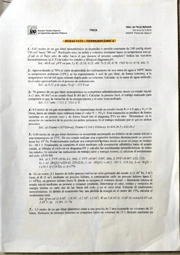Todos los ejercicios de la hoja 11-12 del tema de termodinámica de física, para el parcial del segundo cuatrimestre.