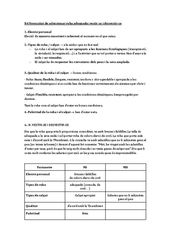 N04. Moure N06 Seleccionar roba N07. Mantenir la temperatura N08. Anar net N09. Evitar perills N10. Comunicar-se i canals N11. Actuar creences N12. Sentir-se útil N13. Recrear-se N14. Aprendre