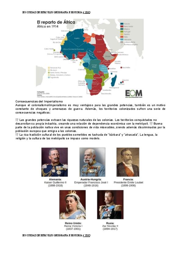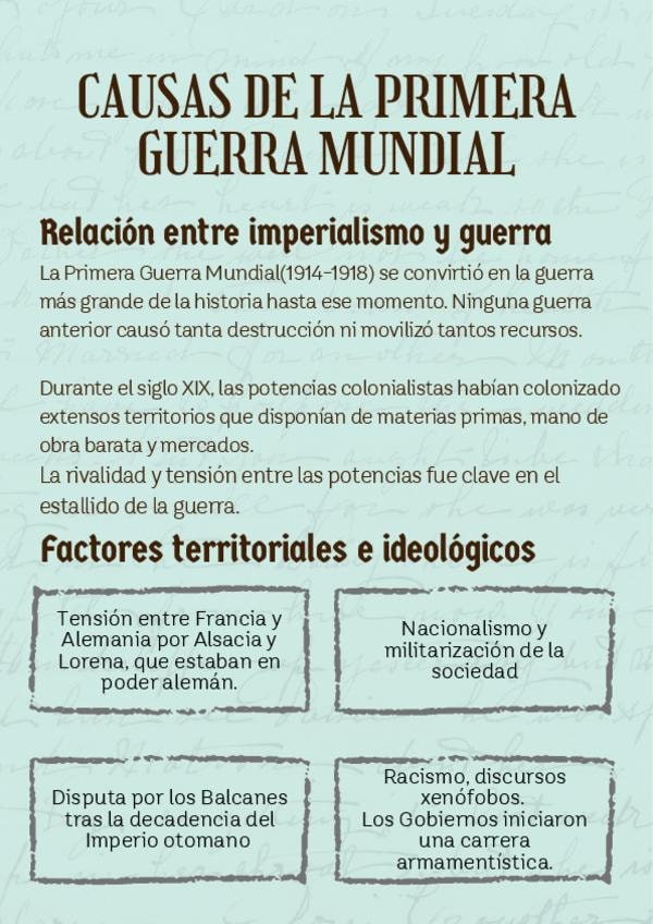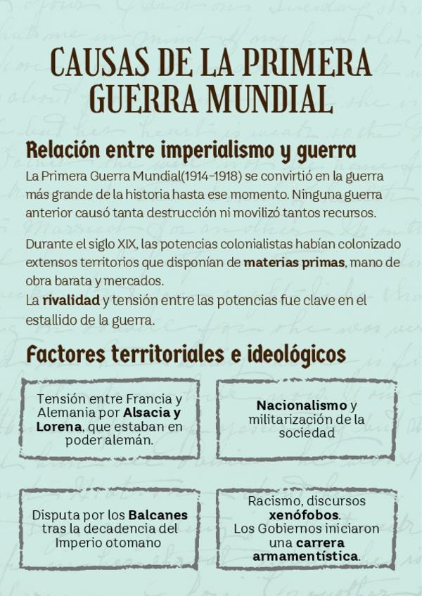 Causas de la Primera Guerra Mundial. Relación entre el imperialismo y la guerra, factores territoriales y factores ideológicos.