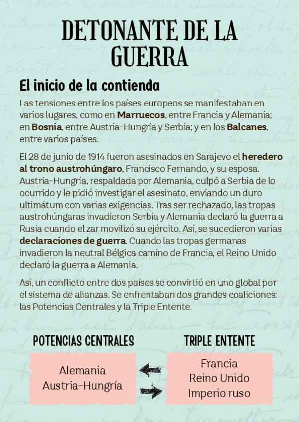 La Primera Guerra Mundial. Causas de la guerra, factores territoriales e ideológicos, características de la guerra, detonante e inicio de la guerra, tipo de guerra...