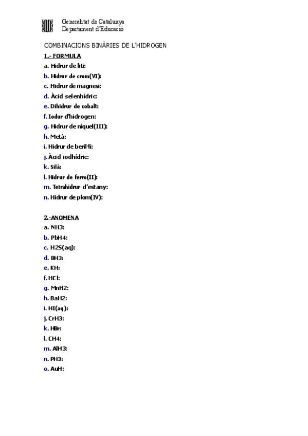 Formulació i nomenclatures de combinacions binàries de l'hidrogen. Exercicis en català. Sense solucionari. (Formulació inorgànica)