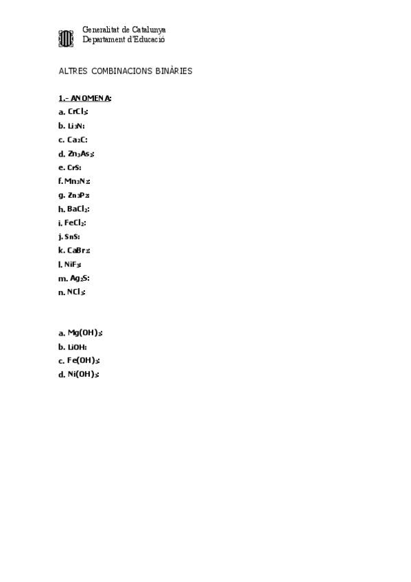 Formulació i nomenclatures de combinacions binàries d'elements. Exercicis en català. Sense solucionari. (Formulació inorgànica)