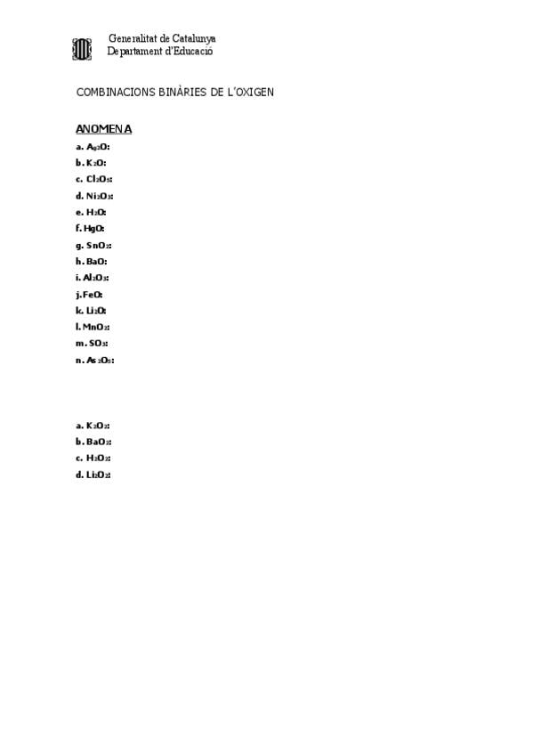 Formulació i nomenclatures de combinacions binàries de l'oxigen. Exercicis en català. Sense solucionari. (Formulació inorgànica)