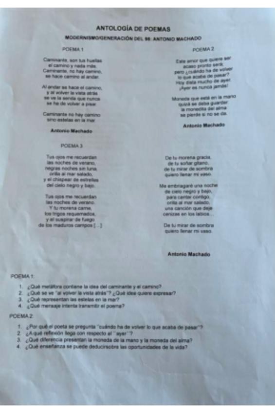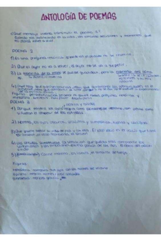 Examen de literatura resuelto. Poemas con preguntas contestadas y recursos literarios identificados.