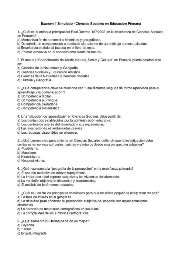 ejemplos de exámenes de Ciencias Sociales del Grado de Primaria de la VIU, 20 preguntas tipo tes y 1 pregunta de desarrollo a elegir y con respuestas.