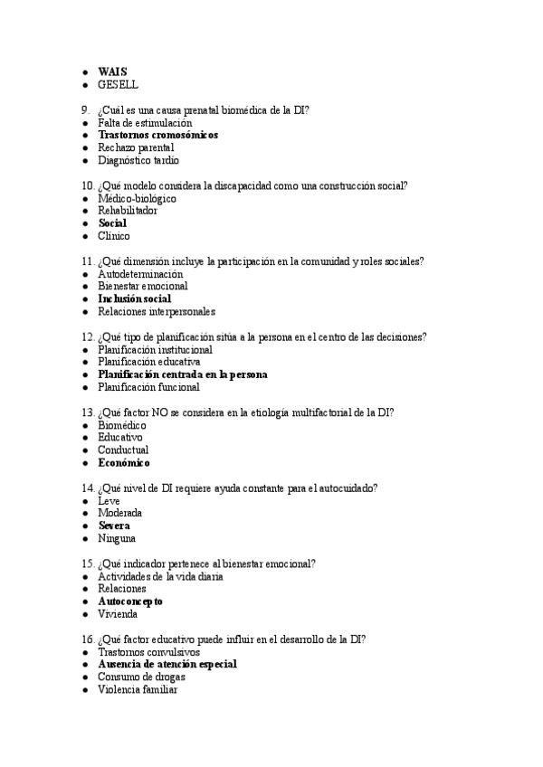 Examen tipo test con respuestas: Discapacidades Intelectuales, sensoriales (auditiva, visual, motriz) | 9 ECTS